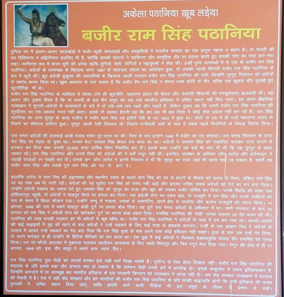Wazir Ram Singh Pathania was such a great personality, a handful of their colleagues on the strength of iron in his soul and the whole British Empire VI was reminded of the milk. Freedom fighter Ram Singh PathaniaSham Singh's father, King Veer Singh of Nurpur state (1789–1846) was the minister. Ten-year-old son, Prince Raja Bir Singh, Jaswant Singh, the heir to the throne of Nurpur, leaving himself has passed away. But the British declared the state to unite under his rule. Wazir Ram Singh was mighty from childhood. Coloniser of the initiative against the nefarious about his heroic colleagues August 14, 1848 the fort was attacked the night of Shahpur Kandi. British army fled, frightened by the attack and several were killed. The next day, August 15 Wazir Ram Singh conquered the fort to his right. Wazir Ram Singh Pathania's announcement was cheered as kings of the hill about five hundred of the brave warrior Tue Singh Manhas and Jasrota leadership came under the flag of the brave Wazir Ram Singh Pathania. Recalled that his mother was Induri Devi Manhas Rajput. Given the serious situation in Jalandhar and Kangra DC DC Henry Lawrence warns Shahpur Kandi with military team arrived in force and attacked the fort. The war continued for some days, but at the end of Ram Singh Pathania, the lack of food had to evacuate the fort. Overnight he went out with his mates went into the forests of the Mau coat and continued guerrilla war. English army followed him a lot but got tricked to Gujarat. With troops and ammunition from army he increased his strength and Shahpur Kandi Fort, he again took possession. British forces got away from him. British forces have also participated in the Kangra fort. King of Jaswan Umed Singh, the Raja Jagat Singh and Una Duttapur altar of the Sikh Sant Singh also declared its independence. King Pramod Chand of Kangra fort of Sujanpur their crown with a 21 gun salute again wore the British army on the hill kings Sam Price's army, defeated the penalties follow a policy of discrimination. Pramod Chand and other kings captive king to Wazir Ram Singh Pathania Almoda was sent to jail but he did not lose hope and their positions north of Pathankot - 2772 ft above sea level, located on the west side Dlle imposed on the edge. British forces were collected at a place called Kumni ray pell.British army due to a new detachment of the enemy soldiers were thrown badly. Wazir Ram Singh Pathania took the blink of an eye. John Peel and his bodyguards were killed. Stone at the grave of John Peel on the cutting edge of Dlle article still refers to the historicity of the event. Wazir Ram Singh Pathania finally was arrested by fraud at the time when the first worship - were busy in the text. To capture as many enemy soldiers before he returned to worship brought hell. He was arrested and taken to the fort of Kangra and the deep distress. Safe-conduct, given the lure of big estates and wealth. But he did not budge. Stupid life sentence for armed revolution, telling them to crack the case was sent to Kalapani. Rangoon jail going through the torture of this great son of the motherland November 11, 1849 at the age of just 24 years, sacrificed his life to protect the homeland.